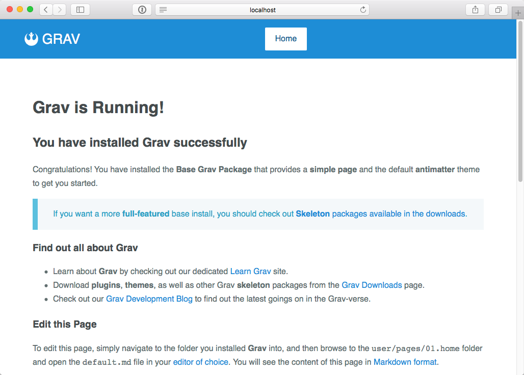 このテーマが実際に動作するか確認するために、ブラウザを開いて、Gravのサイトを表示させてみてください。