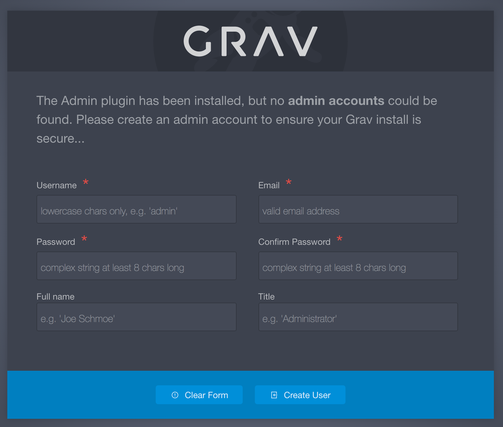 admin (管理パネル)プラグインの機能のため、 login プラグイン、 forms プラグイン、そして email プラグインをインストールしてください。