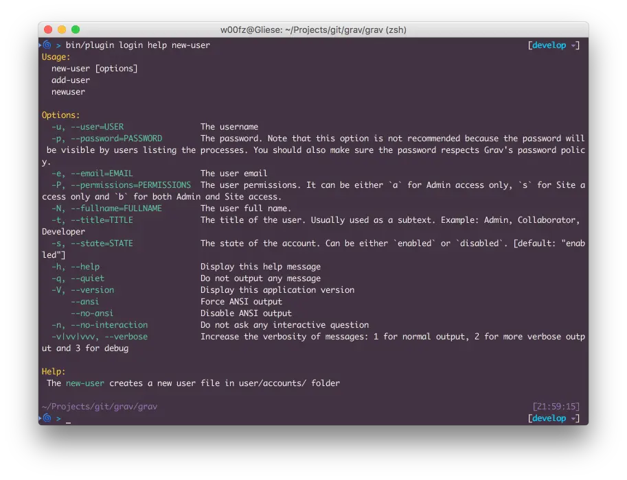 bin/plugin login newuser -u joeuser -e joeuser@grav.org -P b -N "Joe User" -t "Site Administrator"