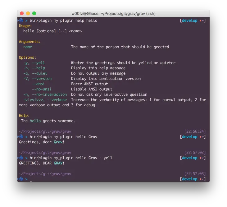 Grav の CLI は、素晴らしい Symfony Console コンポーネント をもとにしており、Symfony のドキュメントが完全に利用可能です。