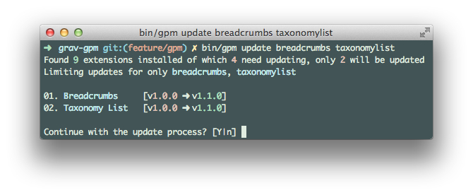 コマンド実行のためには、お好みのターミナルアプリを立ち上げ、 Grav をインストールしたルートディレクトリ内で、 bin/gpm <コマンド> と実行してください。