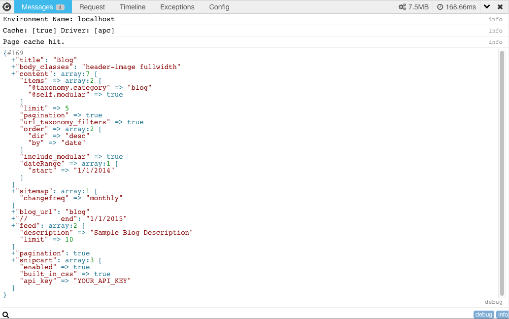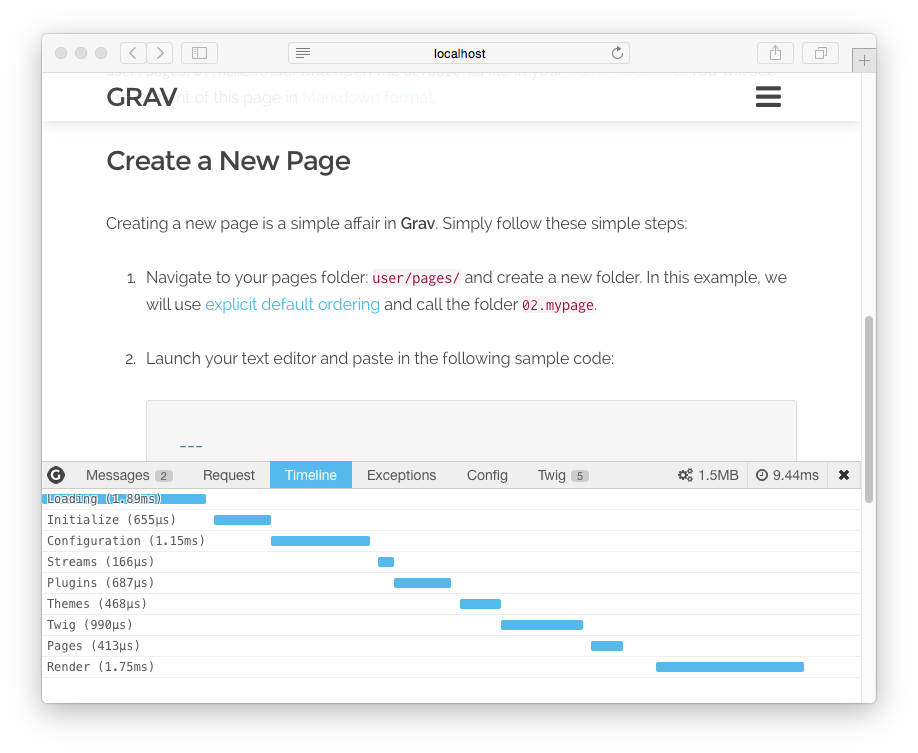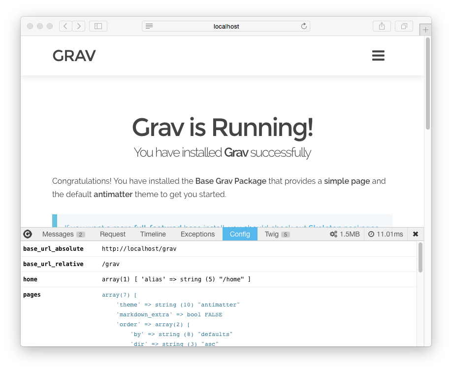 Grav には、 デバッグバー と呼ばれる、デバッグの努力を簡単にしてくれるすばらしいツールがあります。