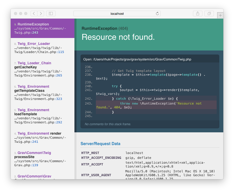 デフォルトの Grav では、有効化されていないため、開発中のエラーハンドリングに役立てるためには、有効化する必要があります:
