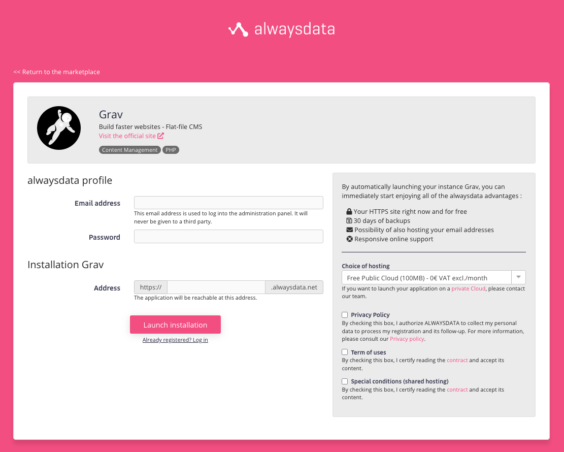 パブリックの マーケットプレイス で Grav を含むたくさんのアプリケーションが提供されています。わずかな情報を提供するだけで、 無料プラン で、 バックアップ込み の (HTTPS) を即座に利用可能 となります。